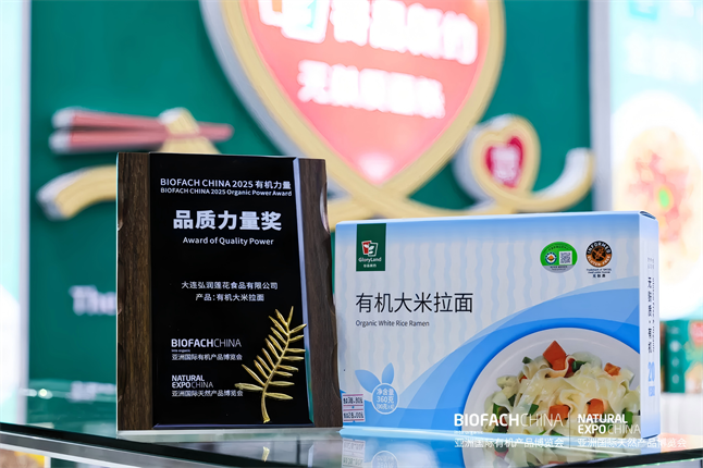 在第18届BIOFACH CHINA展会开幕式暨“有机力量”奖项颁奖典礼中,大连弘润莲花食品有限公司凭借“有机大米拉面”与“有机小米糙米拉面”,摘得“BIOFACH CHINA 2025 有机力量——品质力量”奖项。“品质力量”奖项评选完全基于评委的评分结果,评分涵盖了来自专家、渠道合作伙伴以及媒体等不同领域的综合评价。该奖项只授予以“稳定高品质+可验证差异化”赢得全球采购商口碑的单品。大连弘润莲花食品有限公司,深耕无麸质食品赛道二十载,匠心研发了60余款无麸质有机臻品,远销全球并畅销欧美30余国主流市场——大连弘润,重磅推出无麸质・有机・无添加・零盐脂的全新品类,现货直发高效响应,定制服务灵活适配多元需求!